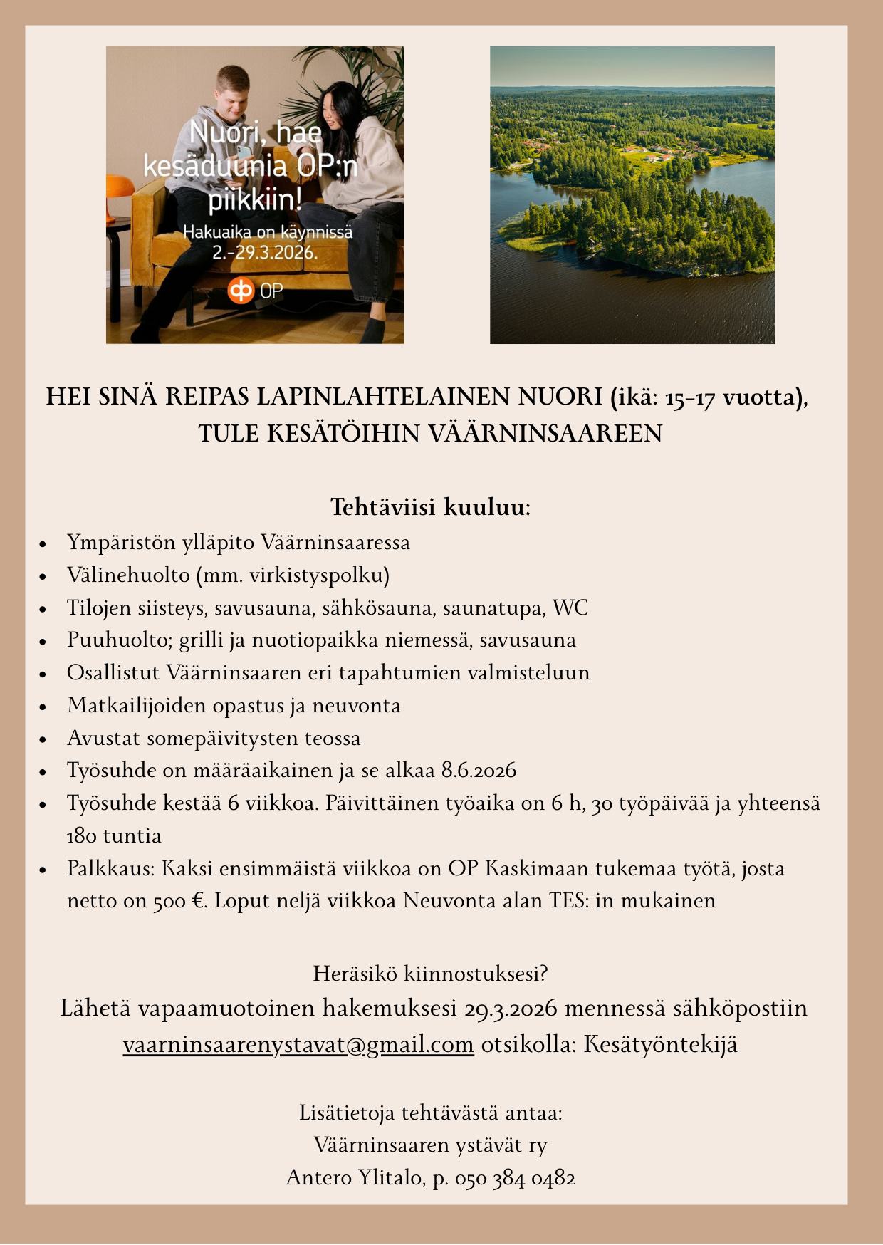 Kesätyön hakuaika 9.-29.3.2026. Liitteessä tarkemmat tiedot hausta.