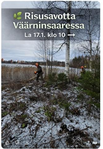 Väärninsaaressa järjestetään raivaustalkoot lauantaina 17.1.2026 klo 10 alkaen. Tavoitteena on avata järvinäkymää sataman puolelta ja siistiä aluetta yhdessä. 🛠️ Raivausta, risujen keruuta ja…