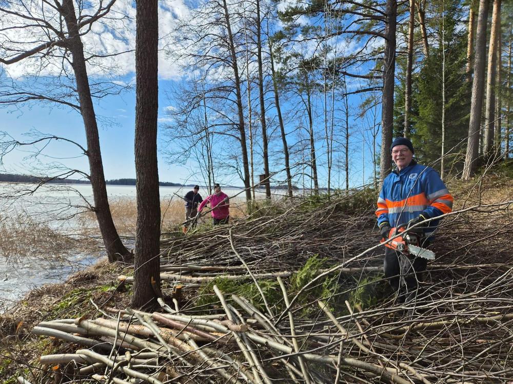 Päivän aikana keräsimme risuja ja puita saaren metsän reunoille, josta ne siirretään lähipäivinä pois. Jyrkillä ranta-alueilla kasattiin risut ja puut rannan tuntumaan, jotta ne voidaan poistaa talvella kätevästi jäätä pitkin. Osa porukasta jatkoi vielä raivaustöitä – ja kyllä, järvinäkymä paranee koko ajan! 🌊