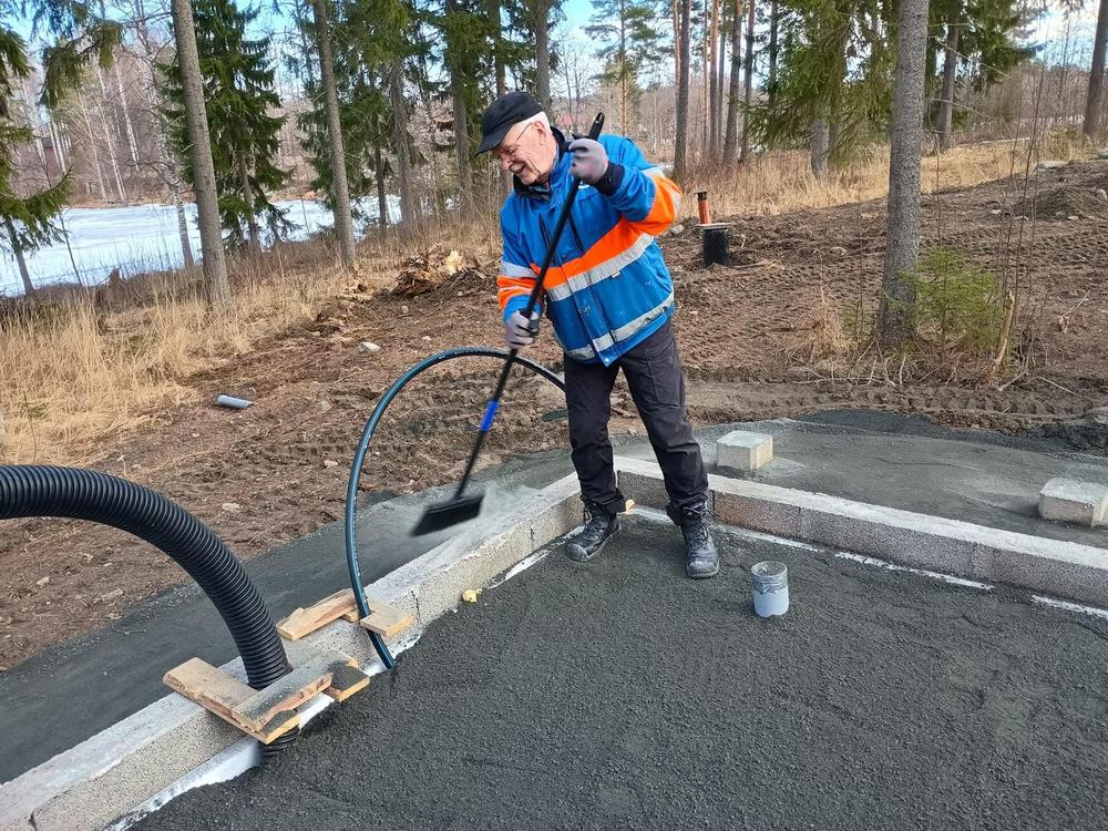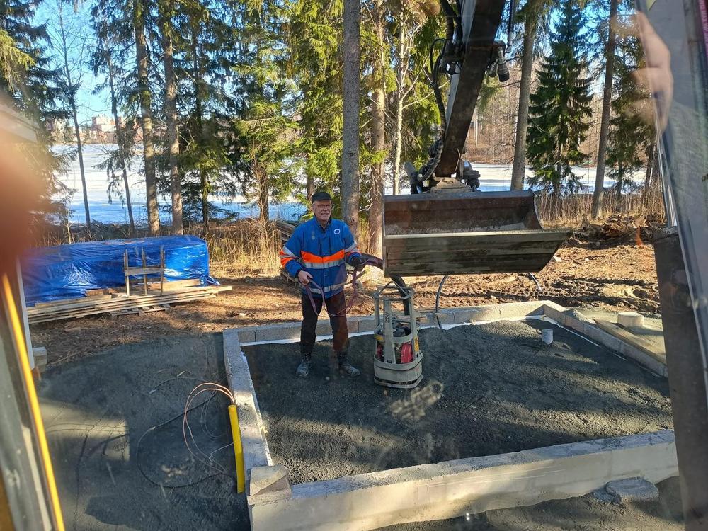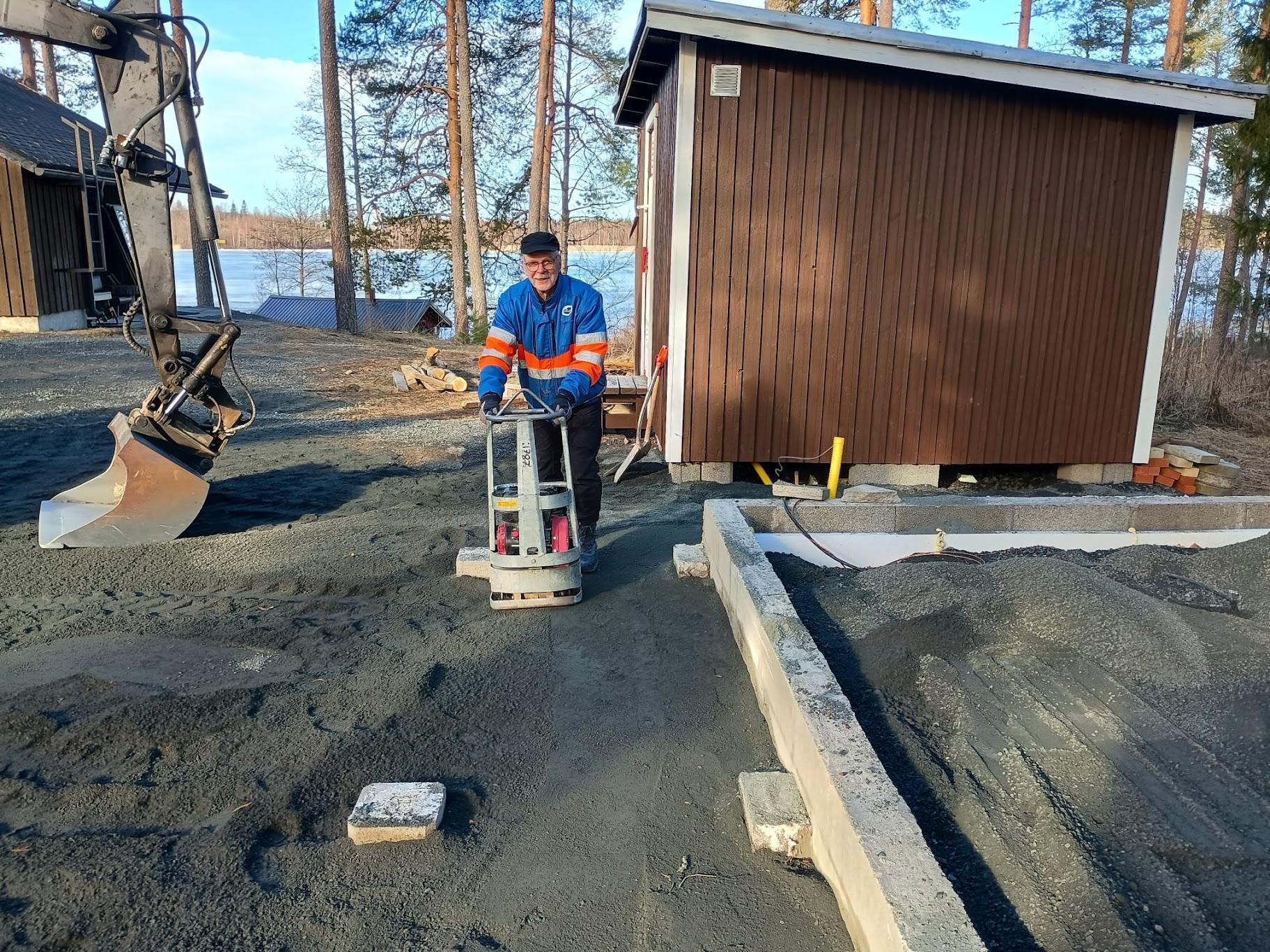 Myös talousrakennuksen työmaalla paiskittiin hommia (2 hlö): pohjia tasattiin ja tÀrytettiin valmiiksi ensi viikon rungon pystytystÀ varten.
