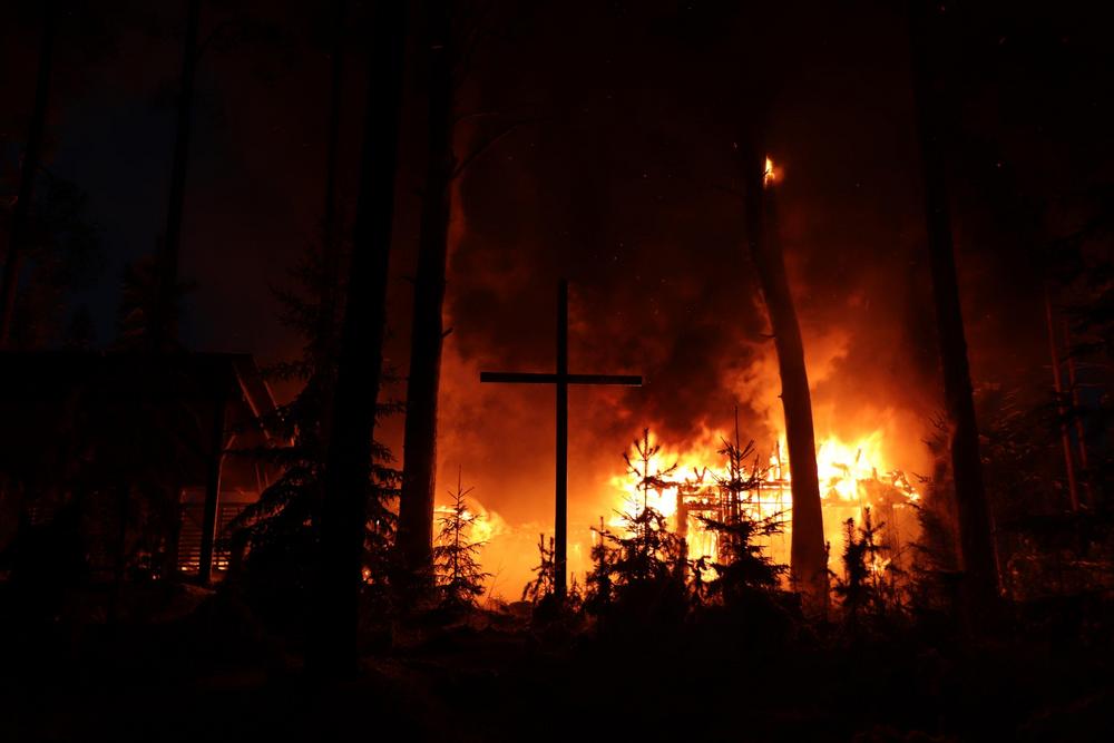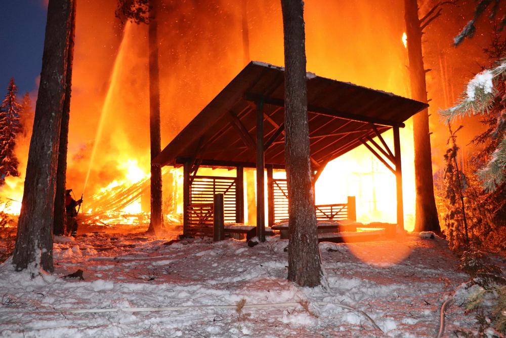 Pelastuslaitoksen hyvällä suunnittelulla leirikeskuksen grillikatos, varasto ja risti pystyttiin suojelemaan tulelta.