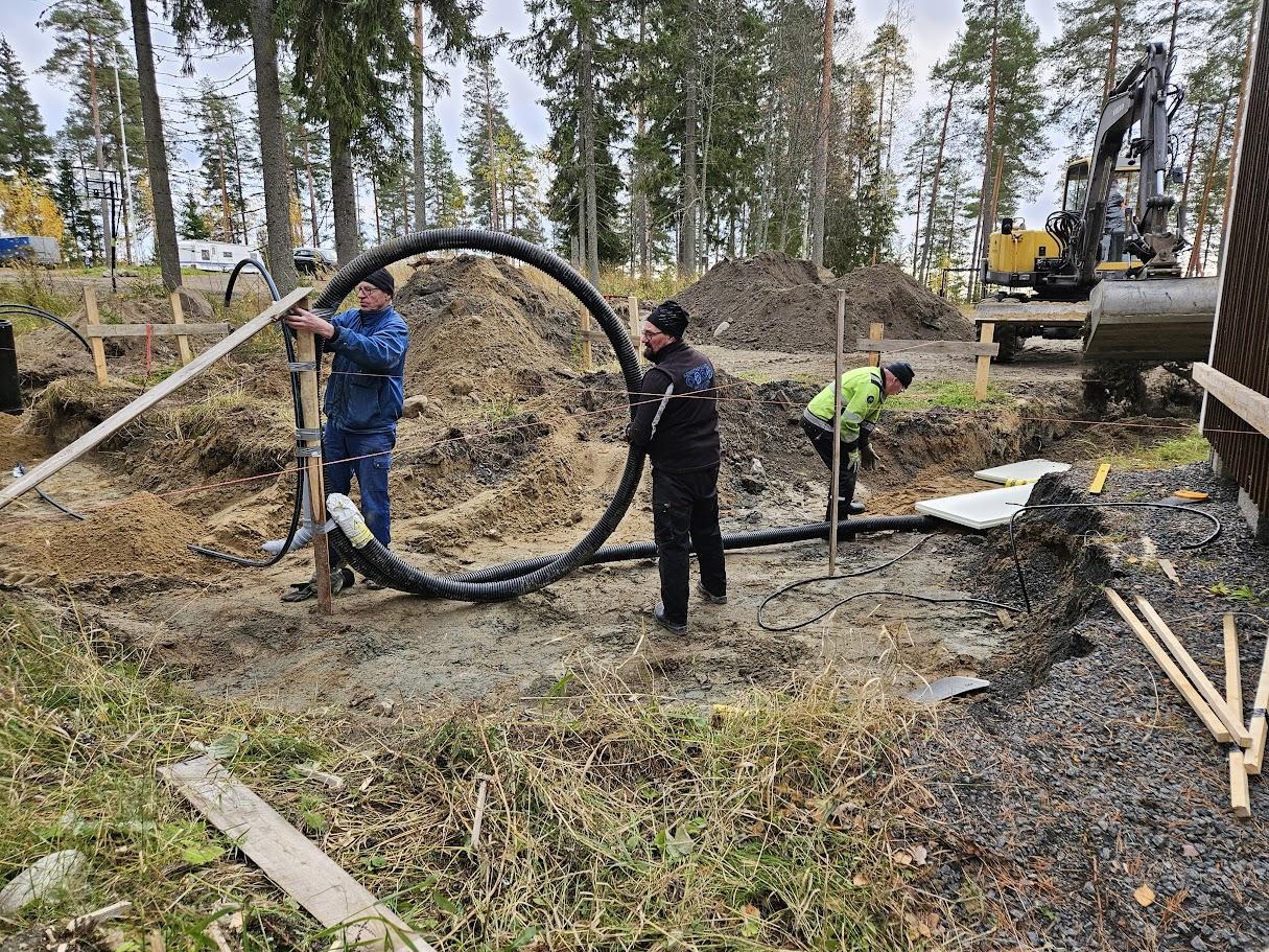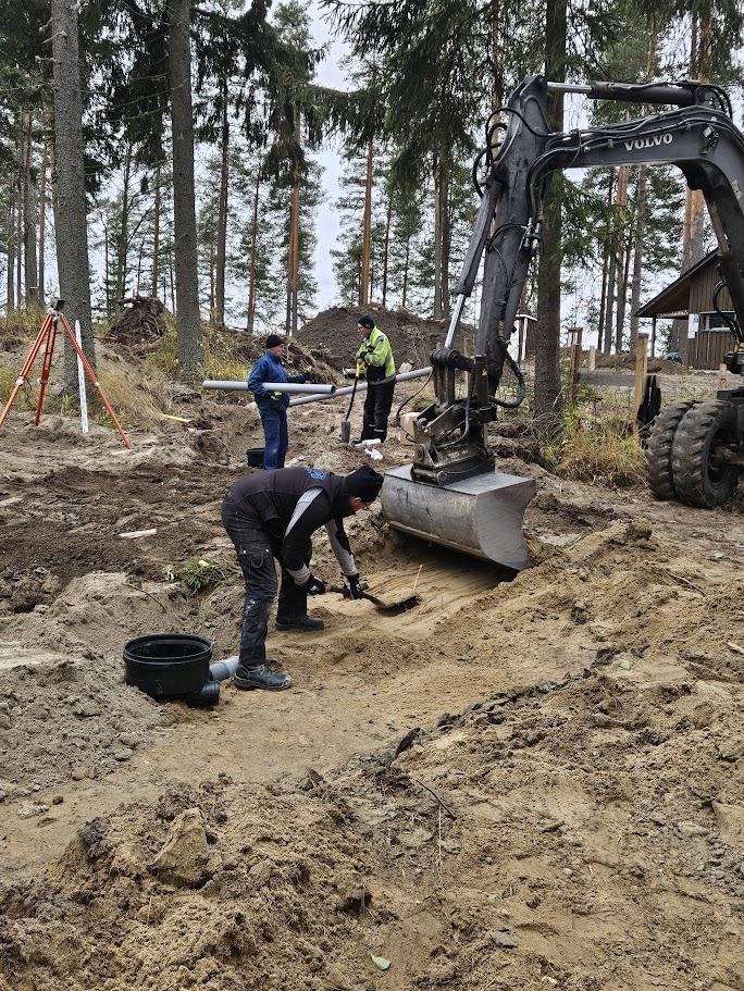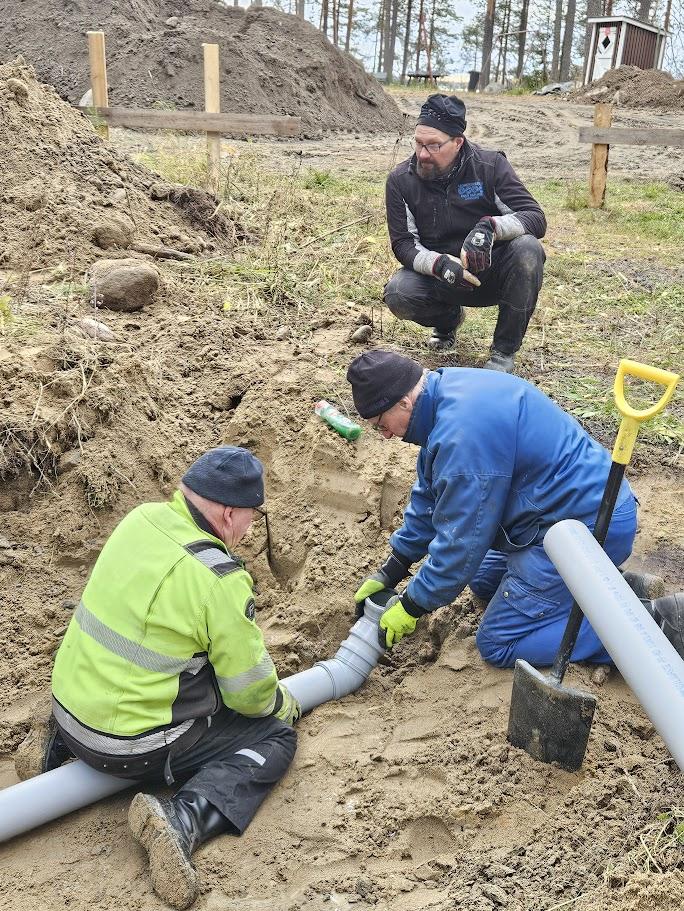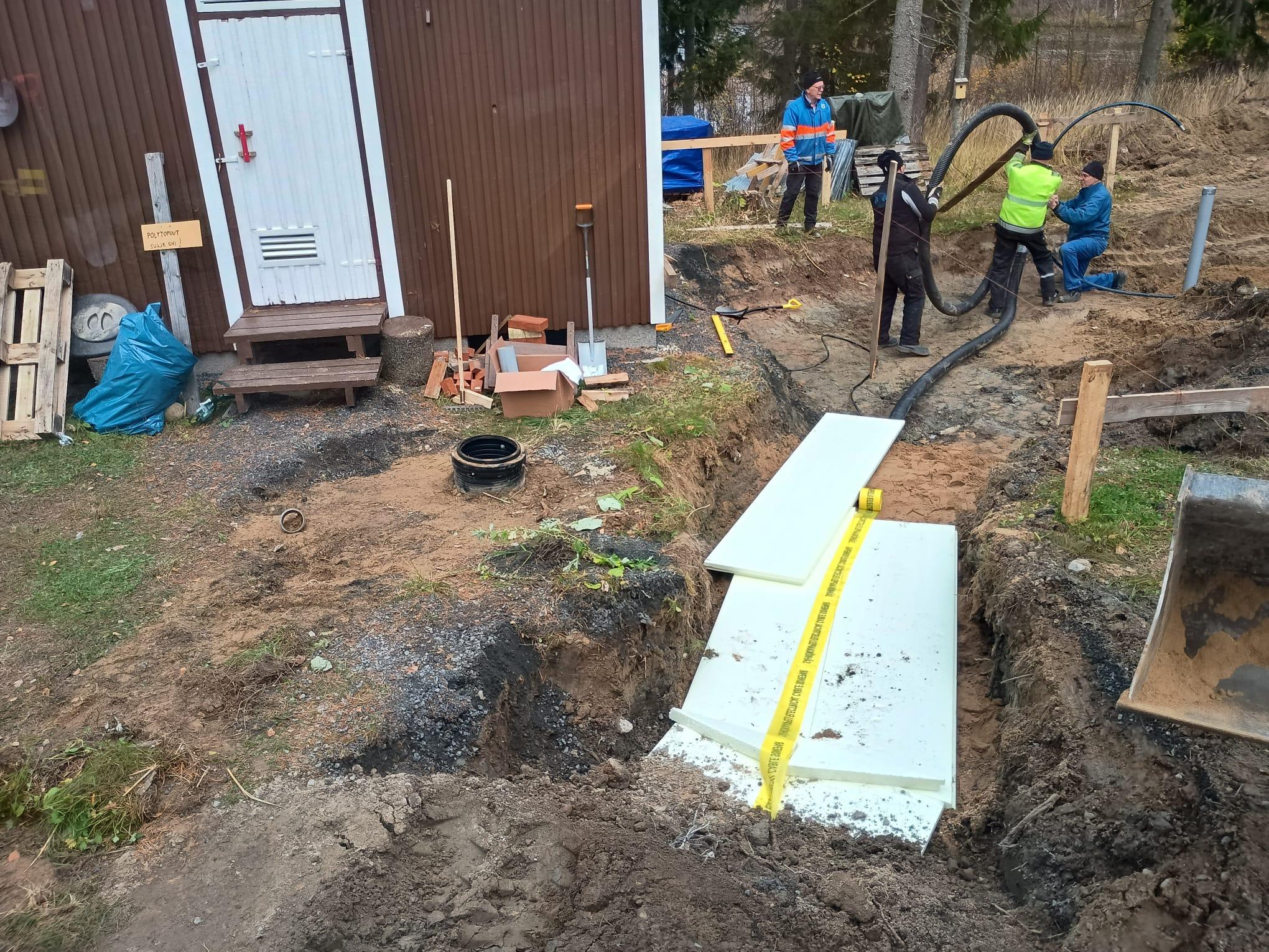 Tänään saimme asennettua kaikki sähkökaapelit sekä viemäri- ja vesiputket paikoilleen. Osa putkista sai myös Finfoam-eristyksen, ja kaivannot saatiin pääosin täytettyä.