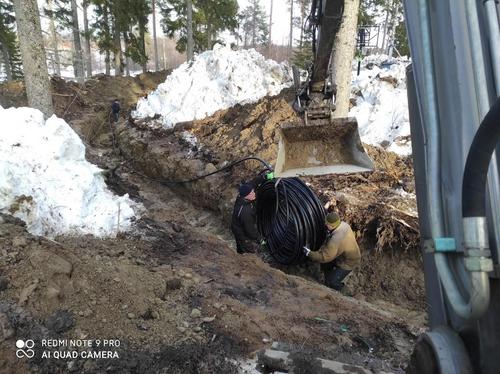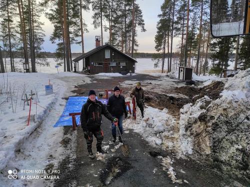 Vesijohtoprojektissa kaivuoja saatiin lauantaina pääosin kaivettua ja päivän päätteeksi porukalla siirsimme vesijohtoputken kelalta kaivuojaan.